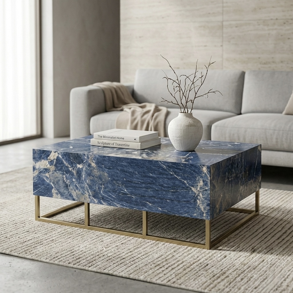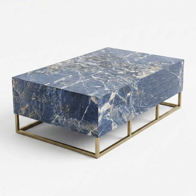 El porcelanato símil mármol azul aporta una identidad única, transmitiendo profundidad, elegancia y distinción, mientras que la estructura dorada eleva la pieza con un aire contemporáneo y sofisticado.