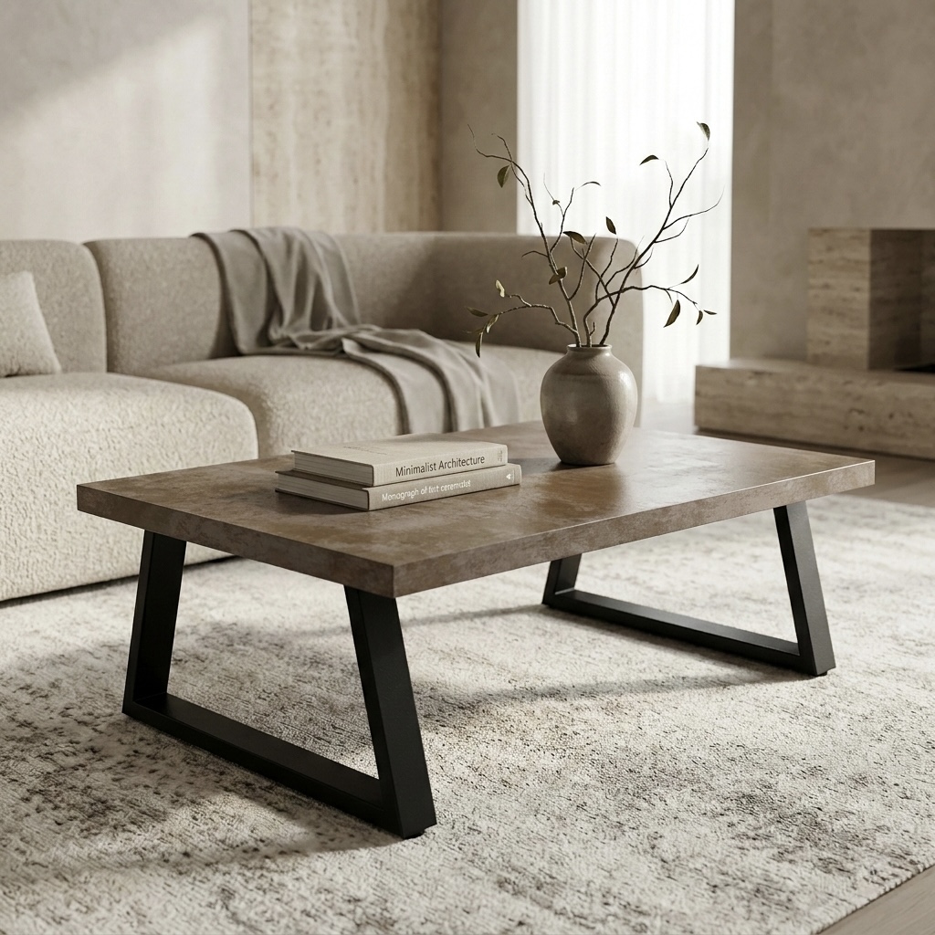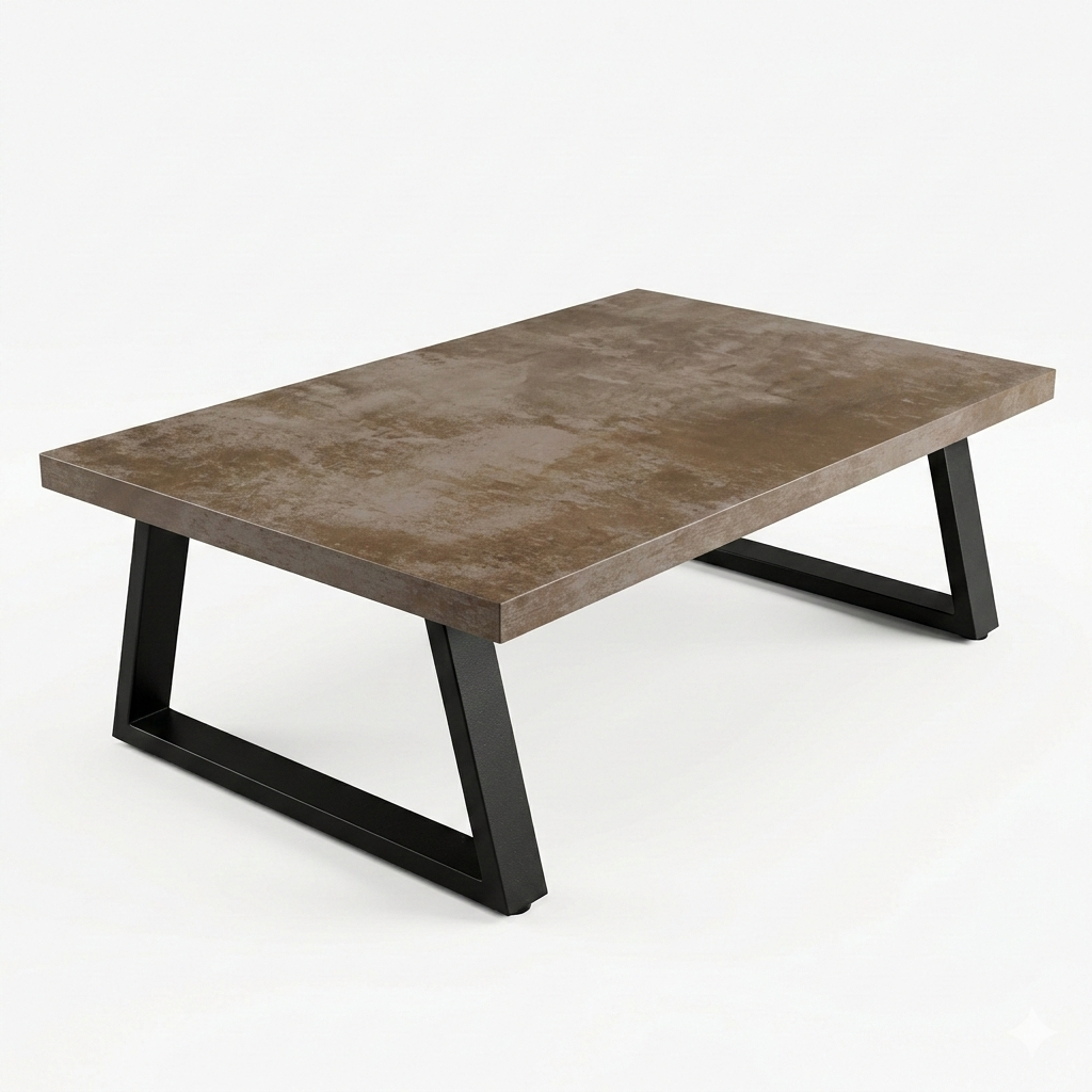 La combinación entre la superficie de porcelanato símil óxido y la estructura de hierro negro genera una mesa de gran presencia visual, moderna y versátil, que se integra fácilmente en distintos estilos de living.