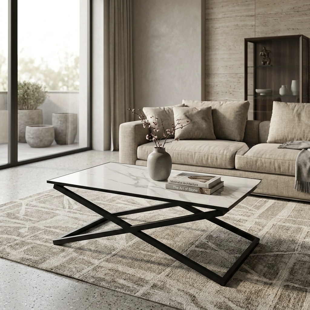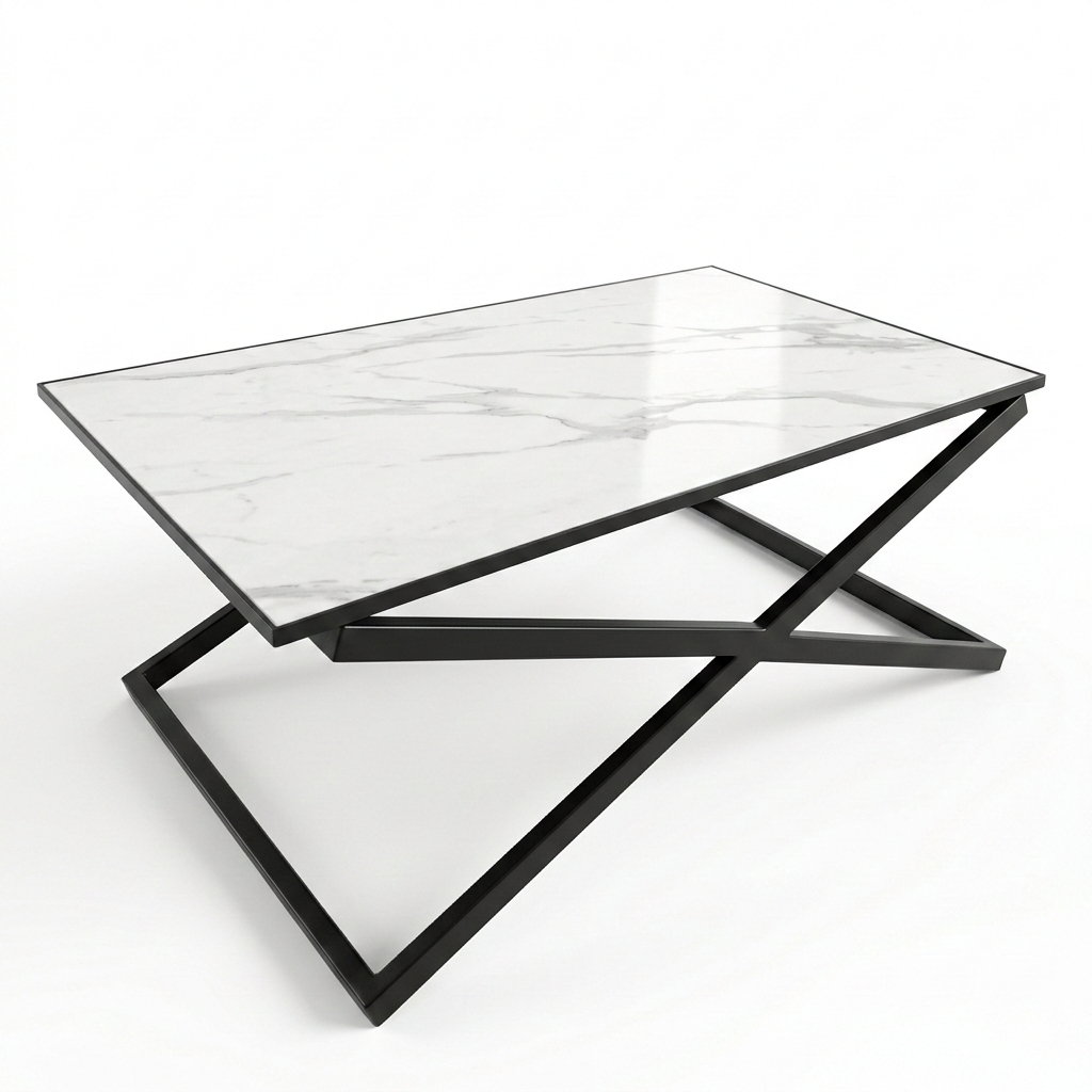 La combinación entre la superficie símil mármol y la estructura cruzada de hierro fino genera una mesa elegante, moderna y versátil, capaz de integrarse con naturalidad en distintos estilos de living.