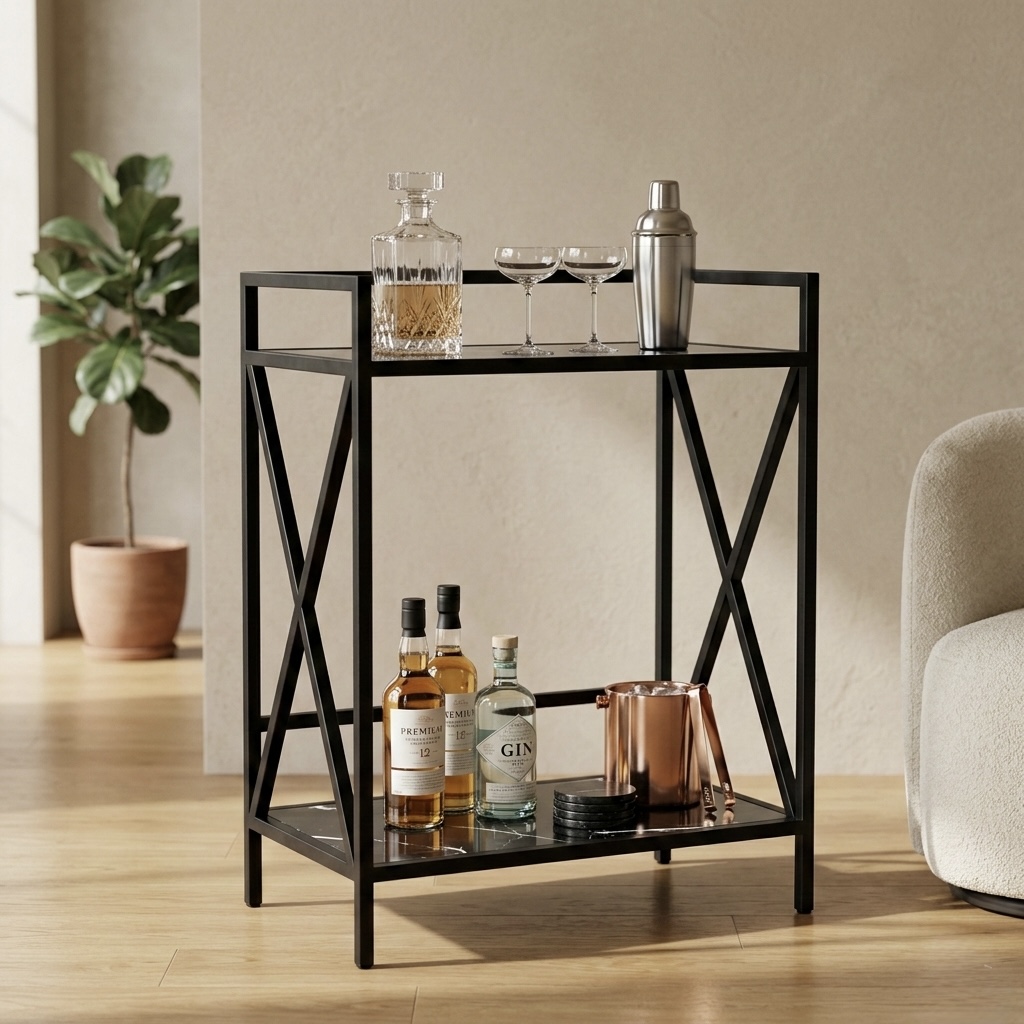 Su estructura de hierro negro aporta solidez y carácter contemporáneo, mientras que la superficie de porcelanato símil mármol suma elegancia atemporal y un acabado sofisticado que realza cualquier ambiente.